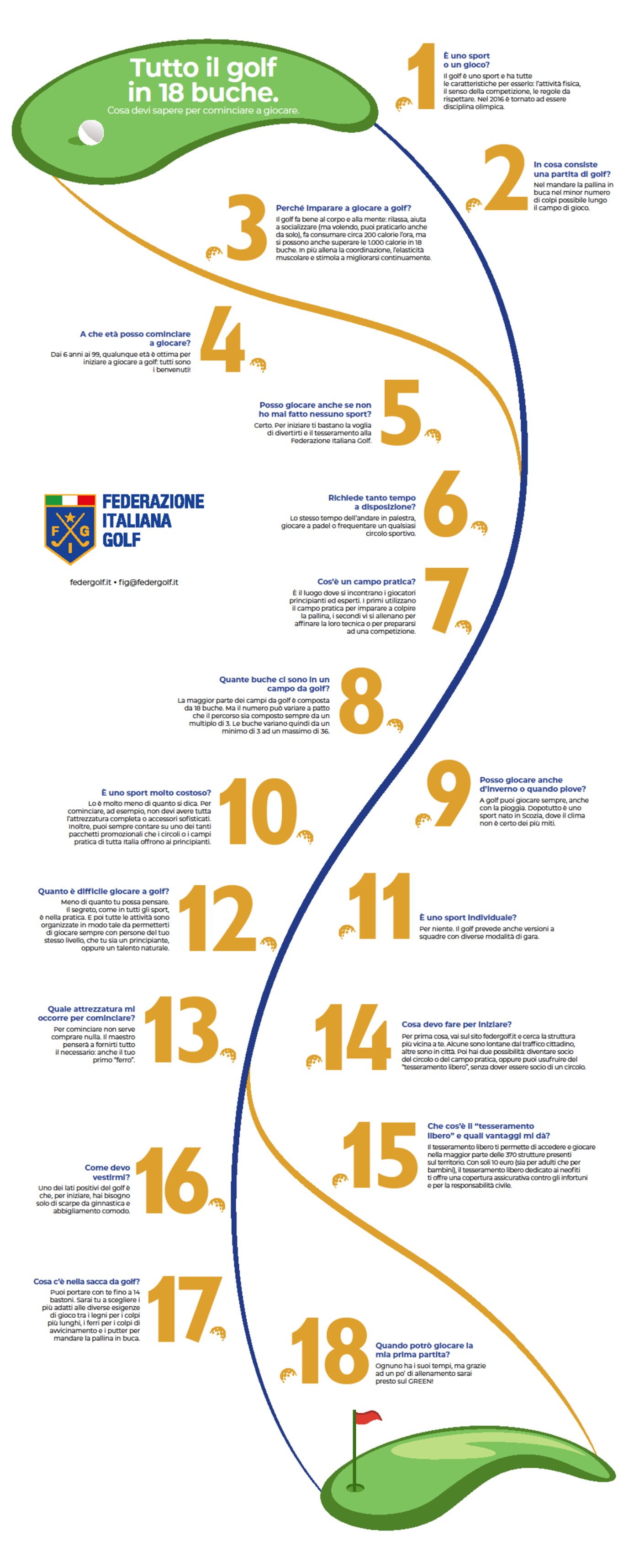 Il Golf è la disciplina sportiva più praticata al mondo e con Rio 2016 il Golf rientrerà per la terza volta nel programma olimpico dopo gli anni 1900 e 1904. Qui sotto nella grafica alcune macro informazioni da tenere presente prima di cercare e contattare un circolo di golf che vi sembra più comodo e agevole nel vostro tempo libero.Lo Spirito del Golf - Il golf è giocato, per la maggior parte, senza la supervisione di un arbitro. Il gioco si affida all’integrità dell’individuo nel dimostrare riguardo verso gli altri giocatori e nel rispettare le Regole. Tutti i giocatori dovrebbero comportarsi in modo disciplinato, dimostrando sempre cortesia e sportività, indipendentemente da quanto competitivi possano essere. Questo è lo “Spirit of the game” del golf. Essere un giocatore di golf è soprattutto uno stato mentale, una filosofia di vita che comporta il rispetto del fair play. Lealtà, Onestà, cortesia, autodisciplina, .